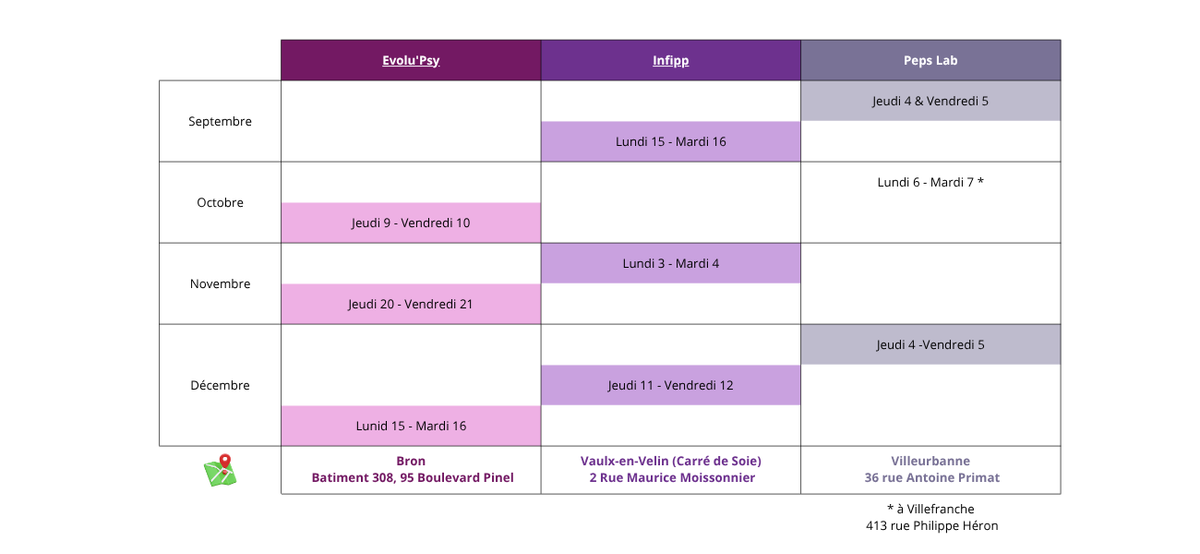 Parmi la liste des formations existantes, voici la liste des sessions (de 2 jours consécutifs) à venir sur lesquelles vous pouvez vous inscrire via la CPTS :